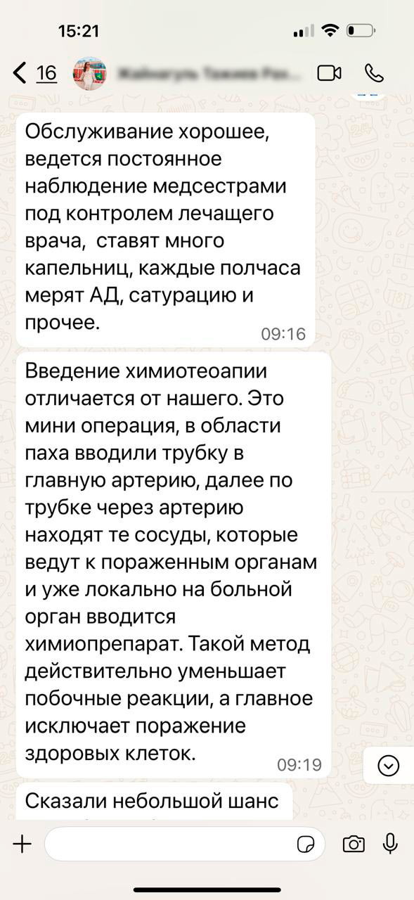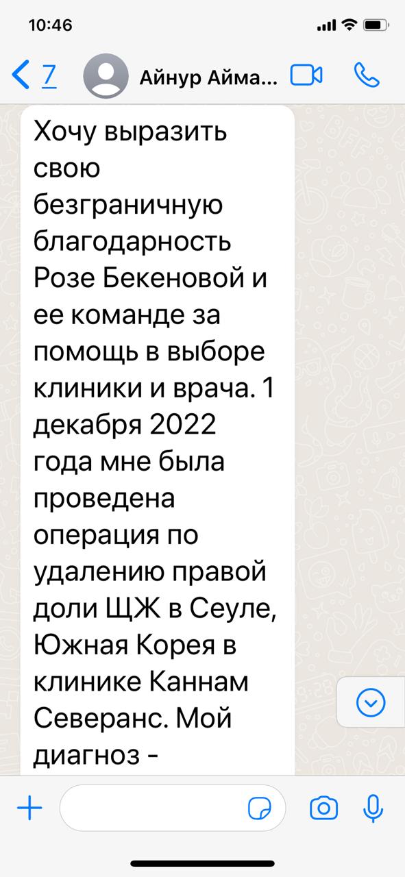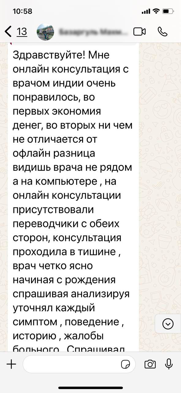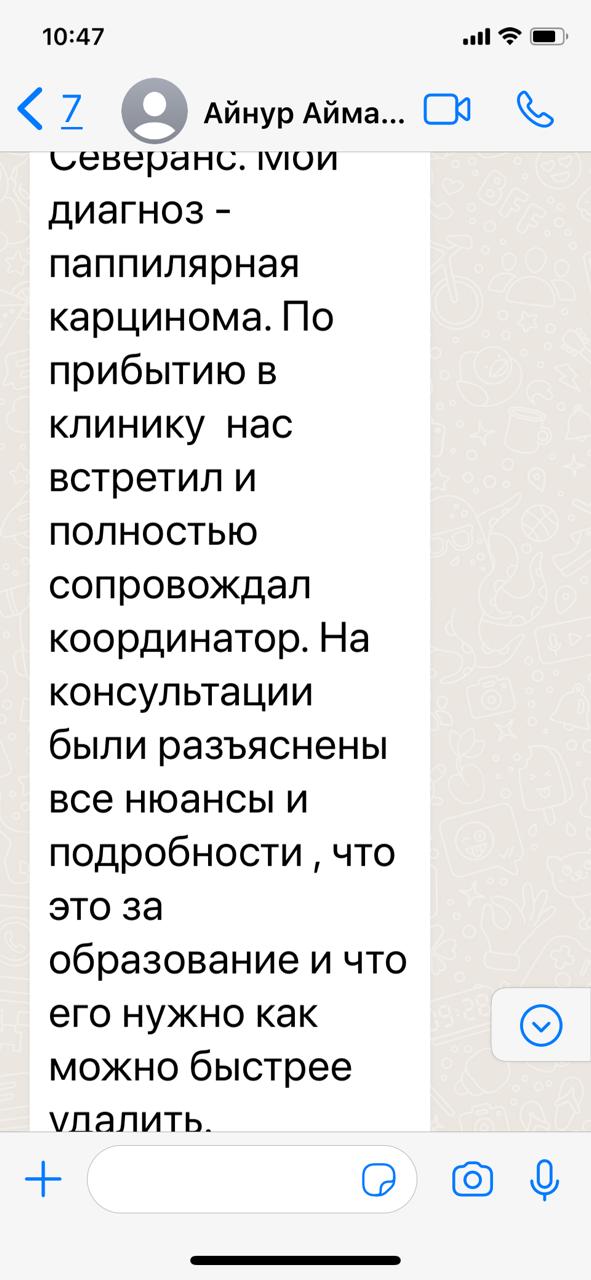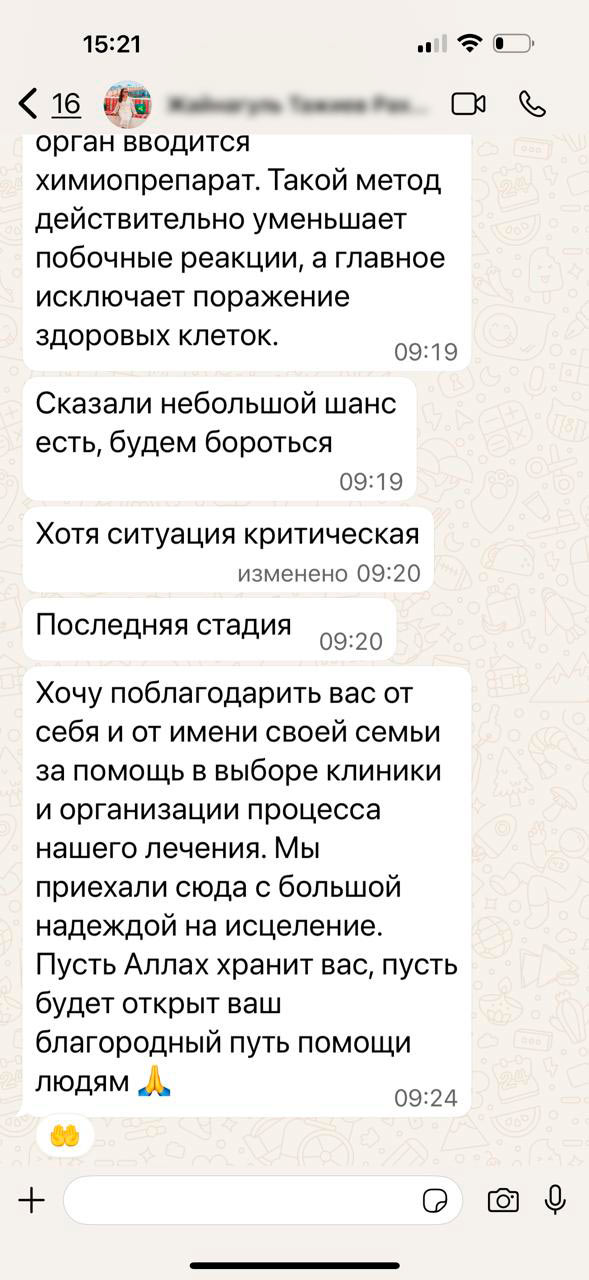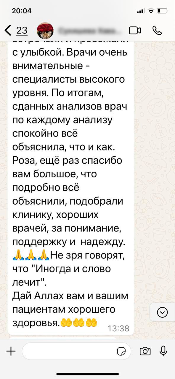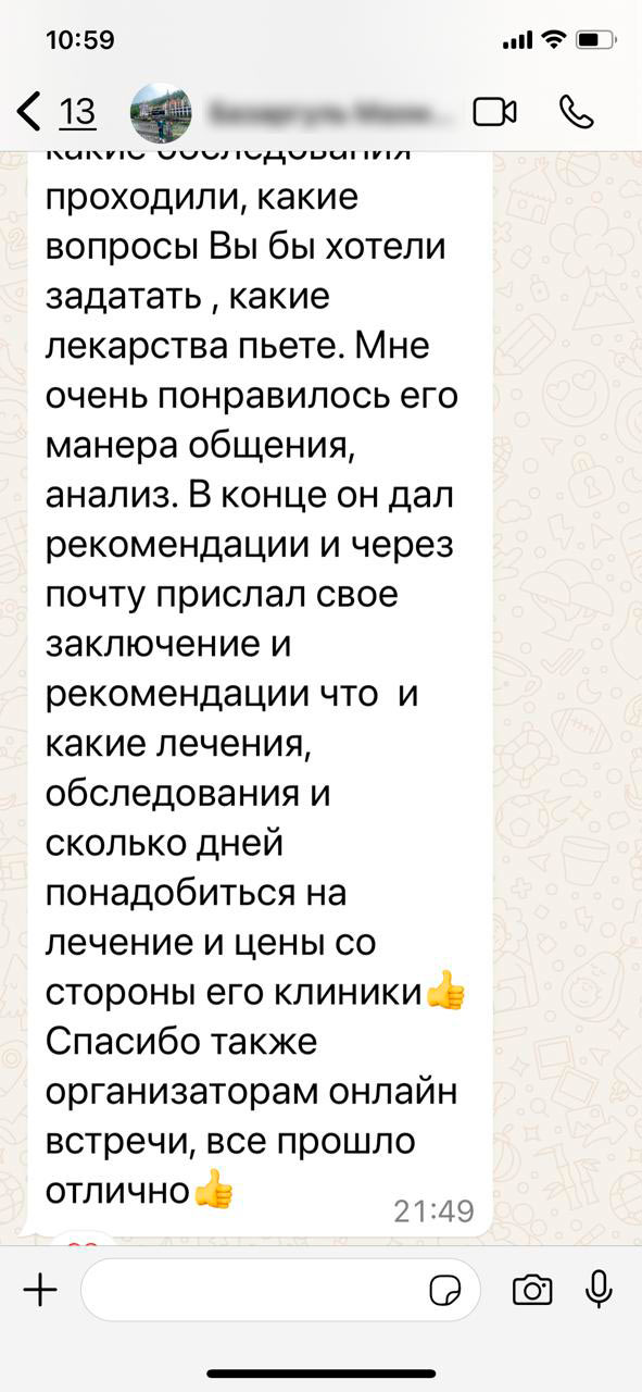 Пациент связывается с нами по WhatsApp или телефону. Менеджер уточняет цель обращения, диагноз и основные вопросы.